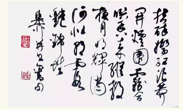 如作于1979年的《红蕖图》便属此例。该图之构图与《采莲图》极为相似,但从技法上,已经完全由写实转向写意,所绘荷干、荷叶均以没骨法写成,辅之以深浅不一的绿色和水墨,恣肆狂放,反映其后期绘画的特色。