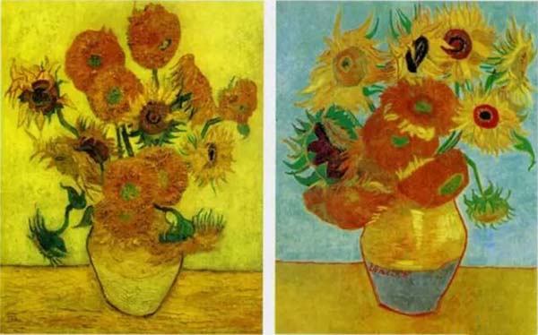 左:有15朵向日葵的花瓶 1889年1月 阿尔 右:有12朵向日葵的花瓶 1889年1月 阿尔