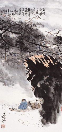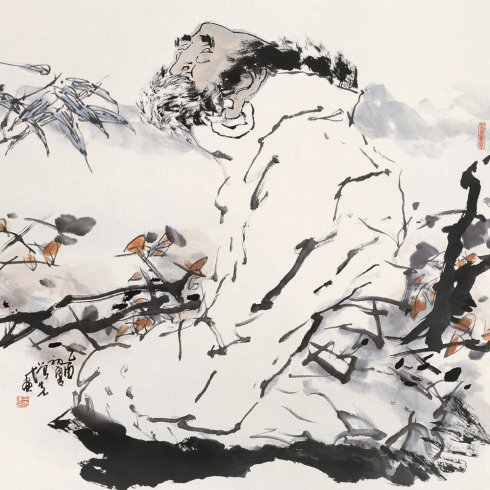如《闲看行路人》,图中干笔、湿笔交叉组合,线条苍茫浑沦。画面从底部的透明色,到追加的每一层笔墨,都能层层体现出来。也就是从画面第一层到最后一层,各种笔法都一一呈现,这样厚度和质感才得以体现。当时他跟靳尚谊说:“我这张画可以和你们的油画相比,在浑厚度上,一点也不逊于油画。”