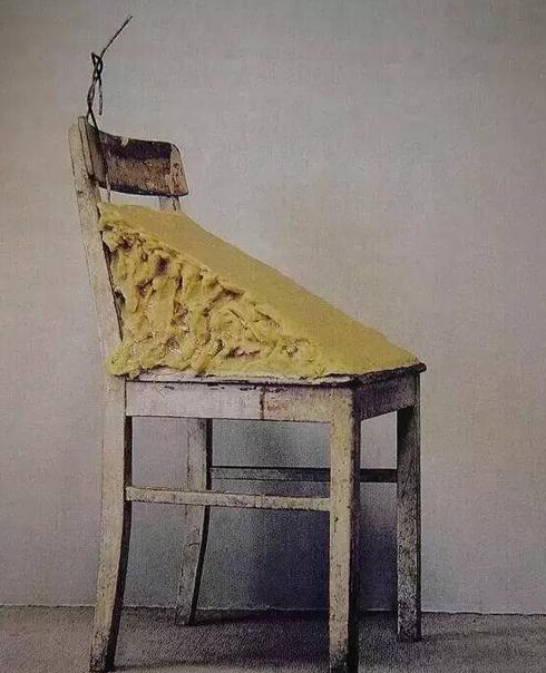 我们再来看一看德国当代艺术大师约瑟夫博伊斯的《油脂椅子》。这件被称为艺术品的东西,是在一把破旧的椅子上涂抹了许多油脂,椅子上还有一段铁丝。